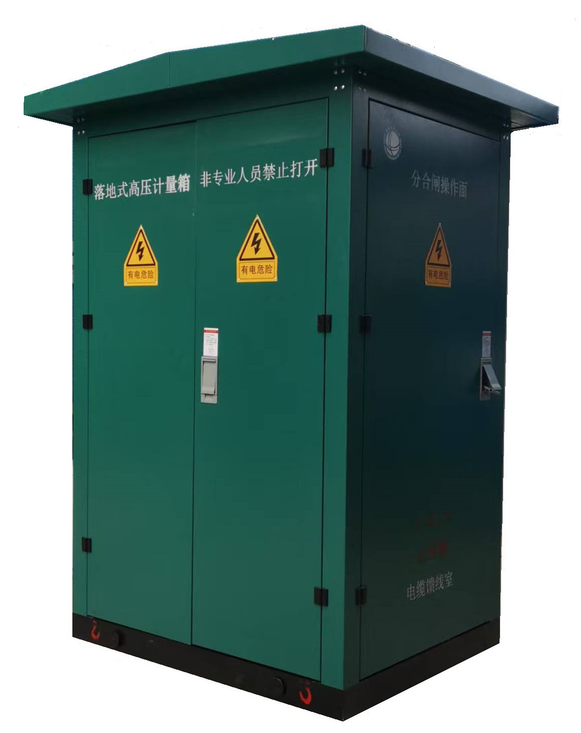 户外高压交流落地式计量箱(以下简称“落地计量箱”),适用于交流三相交流50Hz、额定电压10kv电力系统中作为高压电缆风景线个头也能让电能计量之用,可安装于公园、居民小区、工矿的路边草坪,可直接开门查看表底和就地进行断路器分合操作。落地式计量箱主要由VS1断路器、浇注式组合互感器、避雷器、带电显示器及智能控制装置等部分组成,其计量方式有三相三相制和三相四线两种,可配置零电流互感器,作接地保护之用。