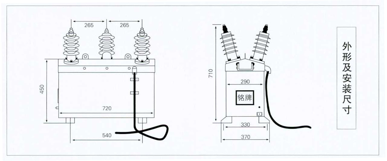3. 计量表箱和组合互感器可一体连接,组成连体高压计量箱,在柱上安装使用;也可以分别安装,柱上安装组合互感器,下面安装计量表箱,中间用铠甲电缆连接。
