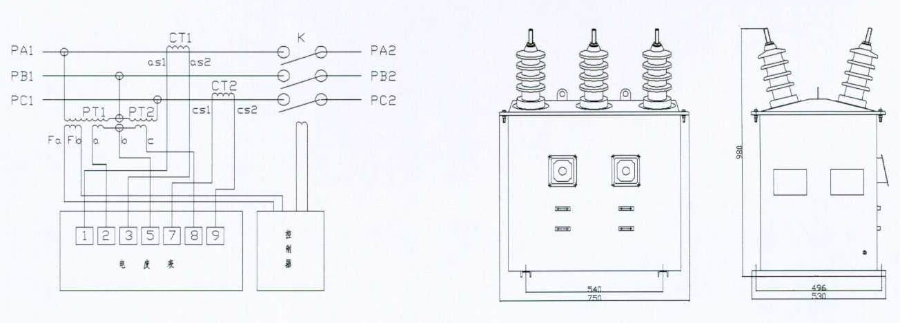 本产品适用于交流50HZ,6-10kv三相电力系统中做预付费高压计量,由高压真空负荷开关和计量用干式电流互感器、电压互感器组合构成,电压互感器同时设置专用绕组做开关的分合闸机构的电源,其整体外形小巧、安装方便。产品的计量部分由两台电压互感器和两台电流互感器组成。电压互感器采用V/V接线。电表箱内由预付费电度表和高压开关控制电路组成,或由多功能电度表和远程抄表控制装置组成。接线采用金属铠甲电缆,具有良好的防窃电性能。